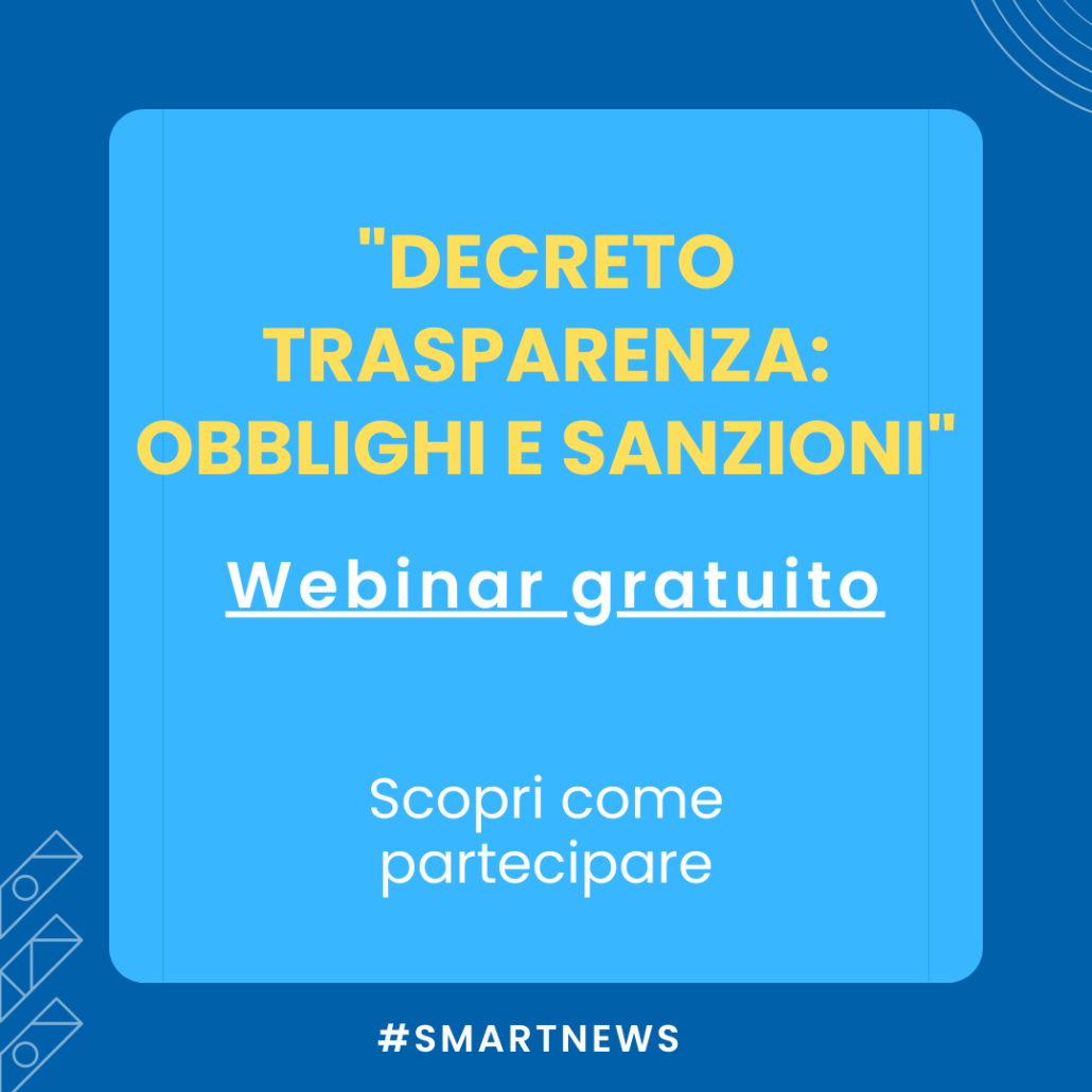 Ti invitiamo a partecipare al webinar: “Decreto trasparenza: obblighi e sanzioni” che si terrà giovedì 27 ottobre sulla nostra piattaforma Smart360, dalle ore 15.00 alle ore 17.00.