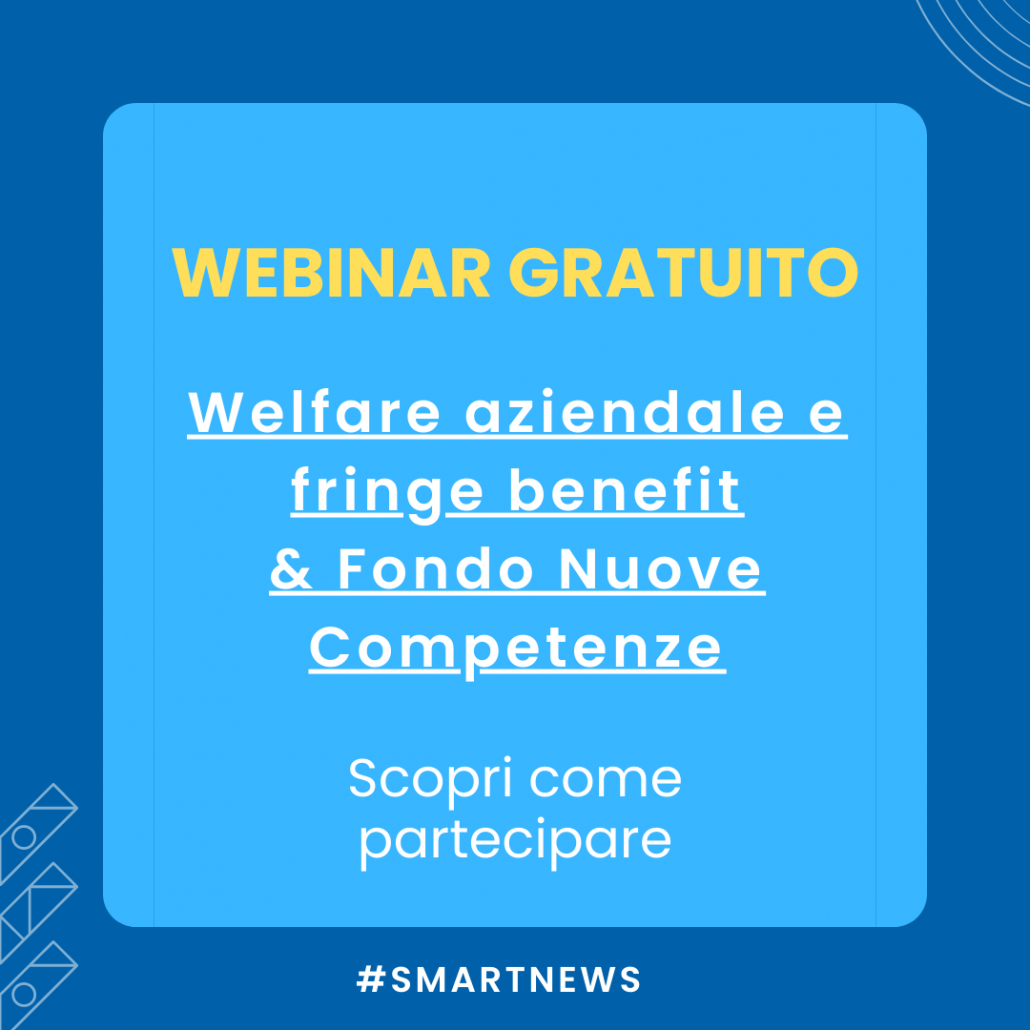 Ti invitiamo a partecipare al nostro webinar gratuito: “Welfare aziendale e fringe benefit & Fondo Nuove Competenze” che si terrà mercoledì 23 novembre sulla nostra piattaforma Smart360, dalle ore 15.00 alle ore 17.00.