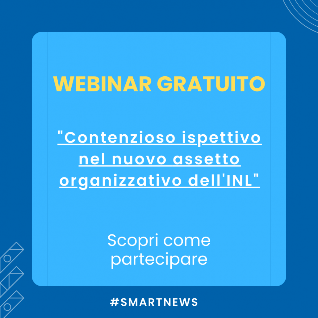 Ti invitiamo a partecipare al webinar: “Contenzioso ispettivo nel nuovo assetto organizzativo dell’INL”, che si terrà venerdì 19 aprile dalle ore 14.30 alle ore 16.30: il webinar è gratuito e si terrà sulla nostra piattaforma Smart360.